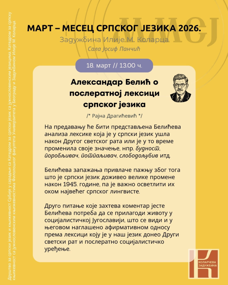 На предавању ће бити представљена Белићева анализа лексике која је у српски језик ушла након Другог светског рата или је у то време променила своје значење, нпр. будност, поробљивач, потпаљивач, слободољубив итд.